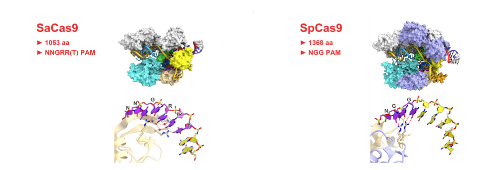 Currently, the two most widely used Cas9 variants are spCas9(derived from Streptococcus pyogenes) and saCas9(derived from Staphylococcus aureus). They require the different PAM downstream of their target DNA.