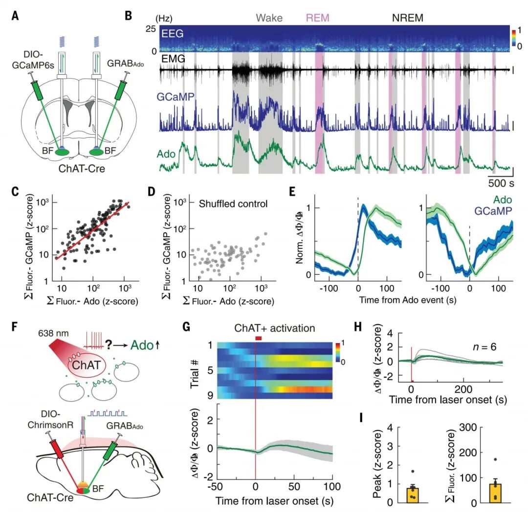 此研究中,作者开发了一种新型的高灵敏度、高特异性和高时间分辨率的腺苷探针(GRABAdo),通过结合光遗传学操作和细胞特异损毁技术,阐明了睡眠觉醒周期中小鼠基底前脑谷氨酸能神经元调节胞外腺苷浓度变化,积累睡眠压力,从而对睡眠稳态具有重要调节作用。该研究为机体在清醒状态下神经活动通过刺激促眠因子的释放而增加睡眠压力的机制提供了新的见解。