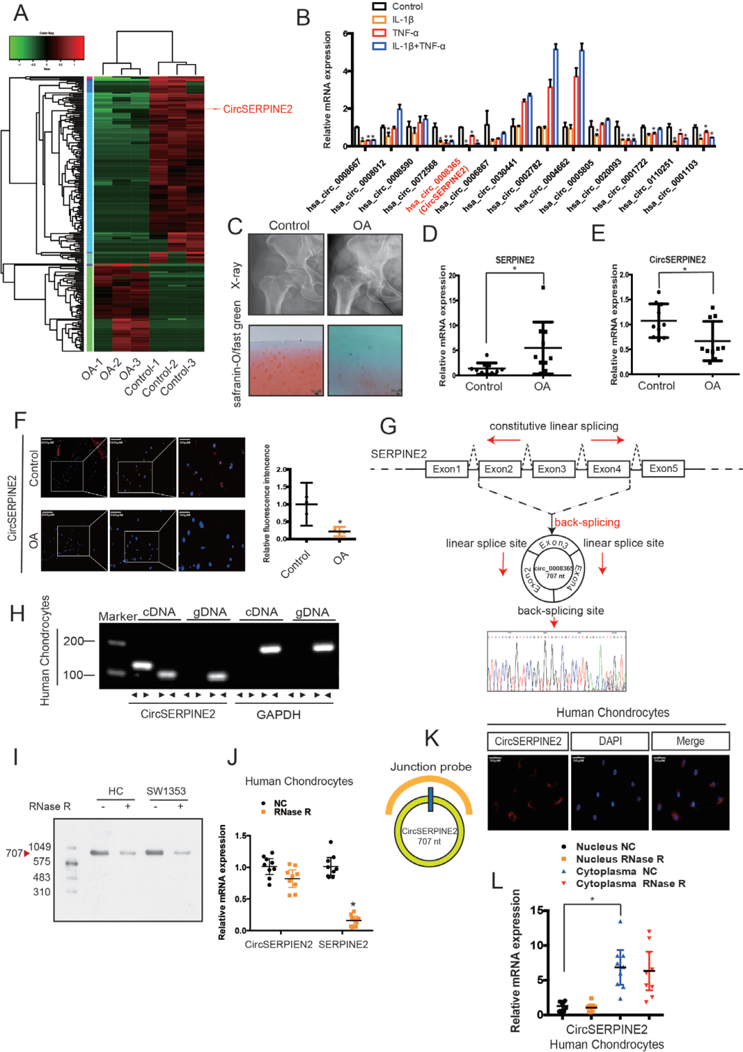 临床OA患者和正常人体组织进行RNAseq分析,发现OA组CircRNA表达呈现差异。RT-qPCR分析确定了25个表达差异最大的CircRNA及14个下调的CircRNA。作者用白细胞介素(IL)-1β和肿瘤坏死因子(TNF)-α处理的的原发性人类软骨细胞(HCs)试验证实了包含hsa_circ_0008365在内的六种CircRNA在OA样本组织中表达下调。Sanger测序法确定hsa_circ_0008365是由Serpine2基因的第二个至第四个外显子环化组成,即5’端剪接位点和外显子3’端相应位点形成的头尾剪接,因此命名为CircSERPINE2。