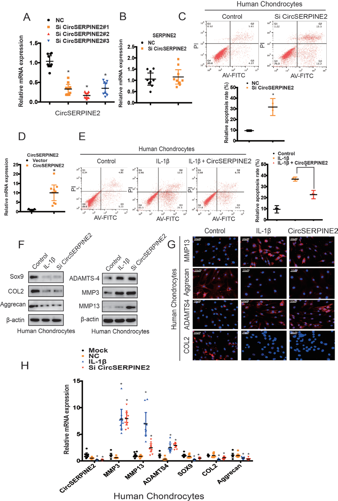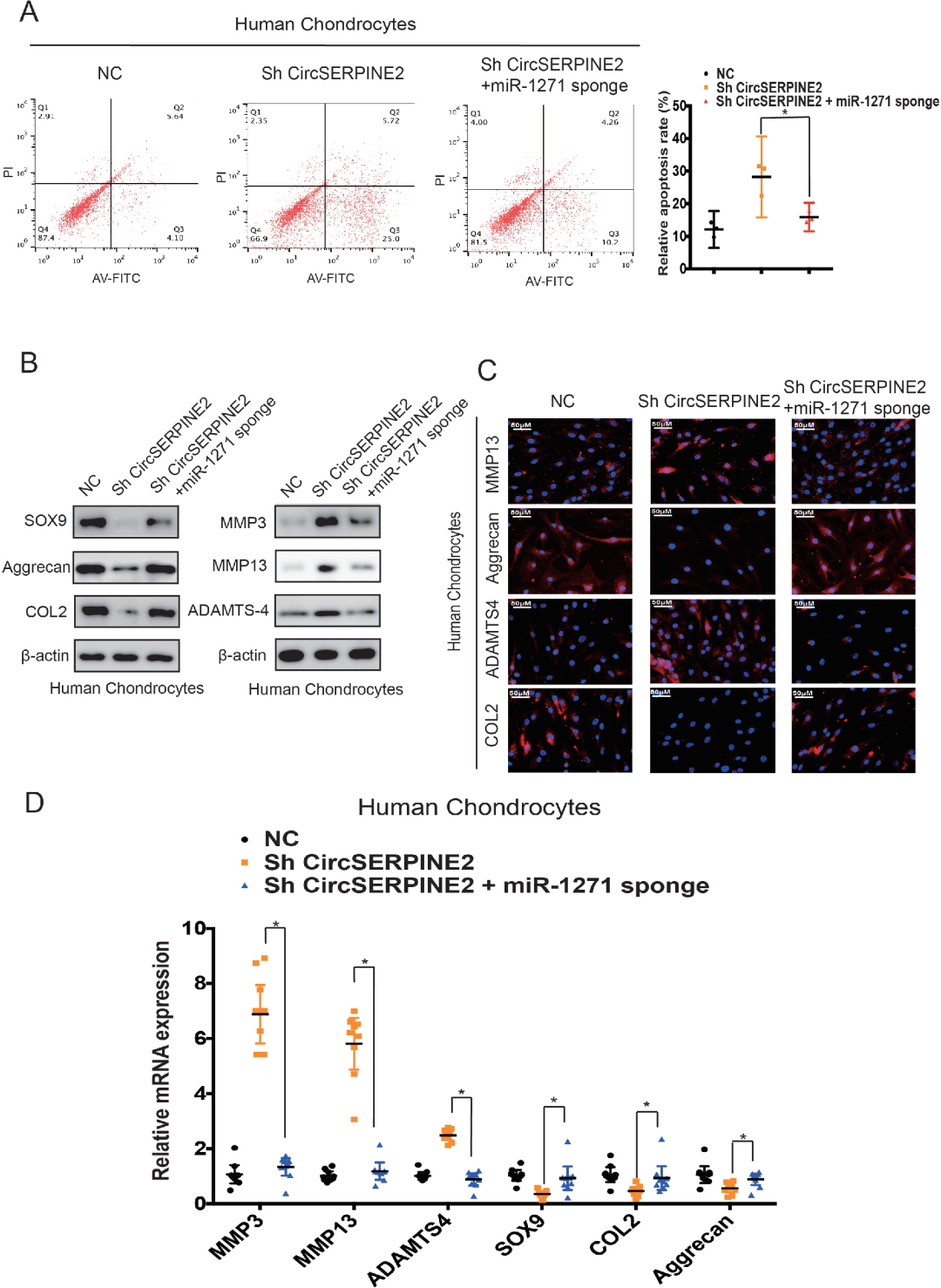 将sh-CircSERPINE2和miR-1271海绵腺病毒共感染细胞。已知下调CircSERPINE2的表达可增加HC的凋亡率,而抑制miR-1271和CircSERPINE2的表达可显著挽救HC的凋亡率。与单独感染sh-CircSERPINE2和miR-1271海绵腺病毒的细胞相比,共感染sh-CircSERPINE2和miR-1271海绵腺病毒的细胞中,MMP13、MMP3和ADAMTS4的蛋白和mRNA水平显著降低,SOX9、COL2A1和aggrecan的蛋白和mRNA水平则显著提高。IF结果显示与用CircSERPINE2抑制剂处理过的细胞相比,CircSERPINE2和miR-1271表达抑制剂处理的细胞中,COL2A1和aggrecan表达水平升高,而MMP13和ADAMTS4表达水平降低,表明CircSERPINE2在体外通过靶向miR-1271发挥作用(图4)。