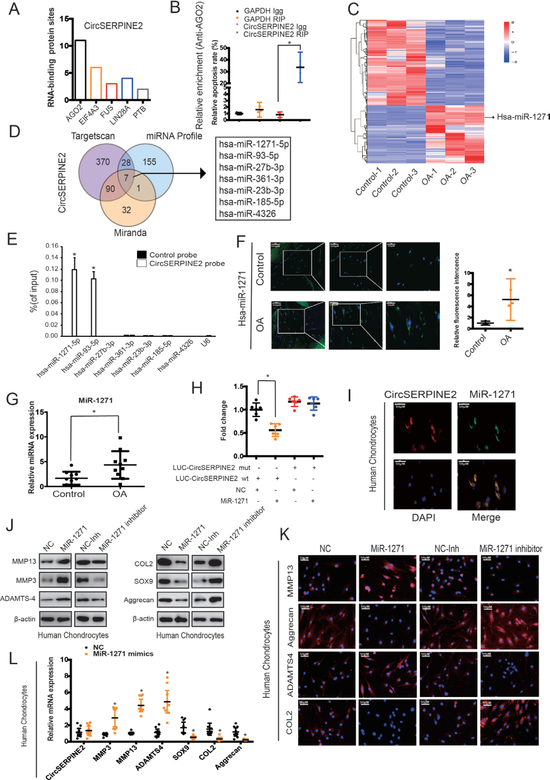 OA患者和正常人体软骨细胞中CircSERPINE2的表达水平检测显示,CircSERPINE2在OA样本呈表达下调模式,在HCs的细胞质中大量表达(图1)。图1 CircSERPINE2在OA软骨组织和细胞中的验证和表达2.CircSERPINE2调节软骨细胞的凋亡和ECM代谢为了评估CircSERPINE2参与了基质降解酶的调控,作者用CircSERPINE2小干扰RNA转染HCs,发现CircSERPINE2表达下调并不影响SERPINE2的mRNA水平,而是增加HCs的凋亡率,CircSERPINE2的过表达可明显抑制IL-1β诱导的HCs凋亡率。WB结果显示抑制CircSERPINE2的表达增加了MMP3、MMP13和ADAMTS4(基质降解相关酶)的表达,降低SOX9、COL2A1和aggrecan的表达。IF和RT-qPCR结果再次证实,CircSERPINE2表达的下调显著影响了HCs和SW1353细胞(人骨肉瘤细胞)中MMP13、ADAMTS4、COL2A1和aggrecan的表达水平,CircSERPINE2的下调促进了HCs和SW1353细胞凋亡和代谢过程(图2)。图2 CircSERPINE2表达下调诱导软骨细胞基质降解酶的表达3.CircSERPINE2是miRNAs的吸附海绵研究发现OA组织中有191个miRNA表达上调,CircSERPINE2可下调miR-1271和miR-93的表达。WB结果显示miR-1271与基质降解和合成蛋白的表达有关,而miR-1271在10个OA样本软骨中表达上调。荧光素酶检测和FISH实验证实CircSERPINE2与miR-1271结合。miR-1271过表达的细胞凋亡率升高,伴随MMP3、MMP13和ADAMTS4表达的增强,SOX9、COL2A1和aggrecan表达的降低。抑制miR-1271的表达时,基质降解和合成相关蛋白的表达水平则与此相反(图3)。图3 CircSERPINE2作为miR-1271的海绵在HC细胞发挥作用